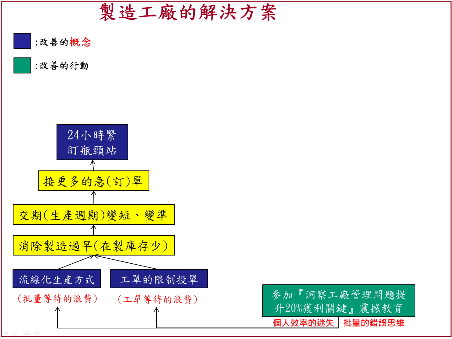 「為了解決這二項錯誤的觀念,也稱為問題的核心,我們學習了二個改善的概念:"工單的限制投單"以及"流線化的生產方式"。」林老師一邊說明一邊打出以下的投影片。